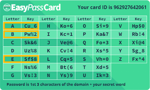 - Using the table on your card, convert the 3 letters to keys e.g. 'eba' would be 'Sf$8' (for E), 'Pw%2' (for B) and 'Cu_6' (for A). You now have the 1st part of your password 'Sf$8Pw%2Cu_6'